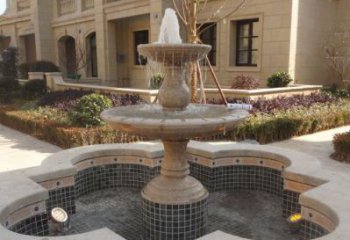 綠意盎然的小區(qū)花園室外多層噴泉石雕裝飾